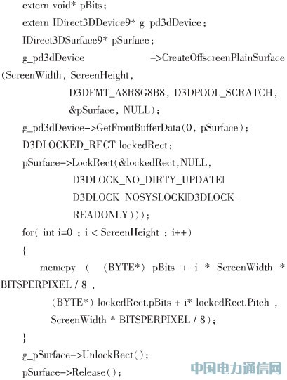 在以下的代码片中,g_pd3dDevice是一个IDirect3D Device9对象,这里假设它已经被初始化过了。这段代码捕获了所需的桌面图像,其后需要对所捕捉到的位图进行处理。此时可以调用IDirect3DSurface9::LockRect()方法,来获得一个指向所所捕获到的位图首字节的指针,然后根据屏幕的尺寸来确定位图的大小,最终将所需的位图数据复制到事先定义好的缓存中。