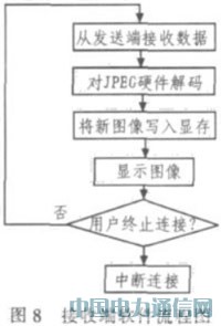 接收端软件主要功能为:接收经压缩的图像数据,控制处理器中多媒体处理核心解码JPEG图像,显示图像。这里也可以采用相似的双缓冲方法,在接收和解压线程之间设立双缓冲,各自拥有一个轮回跳动的指针来交替对两片缓冲区经行操作。