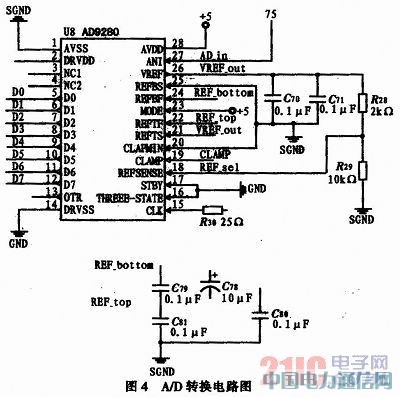 模数转换电路同样采用美国模拟器件公司出品的集成AD9280来实现,其工作时钟频率设定为32MHZ,由FPGA提供。信号由AIN管脚输入,D0~D7输出转换后的8位二进制数据。STBY和THREE-STATE脚接地,以保证芯片正常工作。CLAPMIN接地,把消隐电平钳位为0电平,其电路如图4所示。