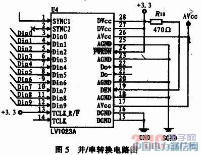 电路采用串化器DS92LV1023集成芯片实现,电路如图5所示,其对应接收端由解串器DS92LV1224集成芯片完成。DS92LV1023可以将10位并行数据转换为串行差分数据流,该差分数据流可以由DS92LV1224还原为10位的并行数据。这一组芯片内部有锁相环,可以为数据输出自己匹配时钟。串化器LV1023参考时钟选为32MHz,数据在该时钟频率下输入,其芯片内部匹配产生数据输出时钟,每一个10位并行数据转换为12位串行数据,其中多出一个起始位和一个终止位,所以有效频率为320 M。解串器的参考时钟定为16MHz,以满足数据传输需求。