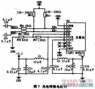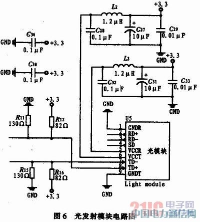 采用型号为HNMS-XEMC41XSC20,工作波长在T1310nm/R1550nm的单纤双向一体化收发模块,将电信号差分数据流转成光数据信号流,电路如图6所示。