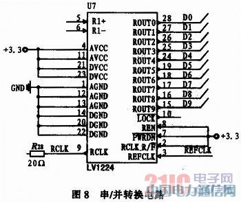 装置采用与发送器中的串化器DS92LV1023相匹配的解串器DS92LV1224。发送器中的串化器将10位的并行数据转换为串行的差分数据流,因此在接收器中需用相应的解串器将串行差分数据流还原为并行数据。