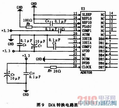 采用美国模拟器件公司出品的AD9708,它属于高性能、低功耗CMOS数模转换器,能提供出色的交流和直流性能,支持最高125 Mz/s的更新速率。工作时钟设为16 MHz,由FPGA提供。