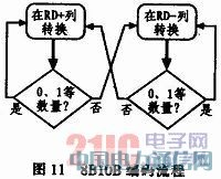 8B10B编码可以看成是5B6B和3B4B编码的组合,组合过后有些编码可能有两个值,“1”和“0”的差值称为平衡度,用RD-表示平衡度为+2或0,RD+表示平衡度-2或0。将转换后的数据接平衡度分为RD-和RD+两列。设变量DISPIN表示正在转换的数的平衡度,DISPOUT表示下一个转换的数的平衡度。初始时设DISPIN与DISPOUT相等,先从RD-中开始转换,如果转换后的数“0”和“1”的数量相等,继续在RD-列中转换下一个数,如果“0”和“1”的数不等,则转到RD+列中转换。同理在RD+列中,如果“0”、“1”个数相等则继续在RD+中,否则换到RD-中。