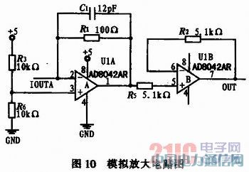采用AD8042实现信号的放大,如图10所示。ULA将AD9708输出的电流信号转换为电压信号,其中C1主要作用是去除高频干扰。ULB作为电压跟随器,用于阻抗匹配。要求的输出阻抗是75 Ω,电压跟随器使输出阻抗为0,再串联一个75 Ω(在ULB的7脚之后,图中未标出),来满足匹配要求。