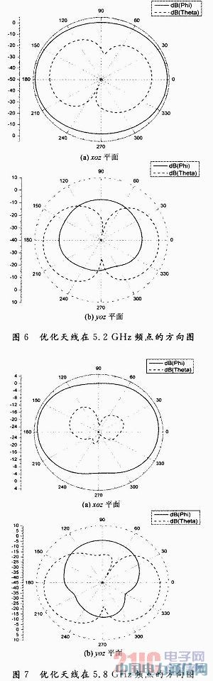 由上述可知,该共面波导馈电的平面单极子倒L-U天线具有高阻抗带宽、小型化的显著特点,其在-10dB处的阻抗带宽有两段,分别为2.36~2.58GHz和3.62~5.96GHz,前一段的相对带宽为8.9%,后一段的相对带宽为48.9%,覆盖了WLAN的工作频带。