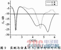 参数S11仿真与实测结果对比图,如图9所示,可以看出,实测结果与仿真结果对比在高频段有较大的偏差,低频段较为吻合。
