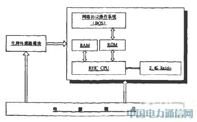 无线生理传感器有两部分组成:生理信号采集部分和无线传输部分。生理信号采集我们可以采用我们所需要的各种生理电极对人体的心电、血养饱和浓度、脉搏等等进行册测量。无线模块我们采用集微处理器和RF芯片一体的S0C芯片JN5121,芯片可以控制整个节点的处理操作、路由协议、同步定位、功耗管理和任务管理。采用该芯片相对于以往Zigbee射频芯片而言,不用外加MCU,有效的节省了芯片外围电路,采用片上芯片方案可以近一步节省几点体积,便于受监护者携带。图2是生理无线传感器方案。