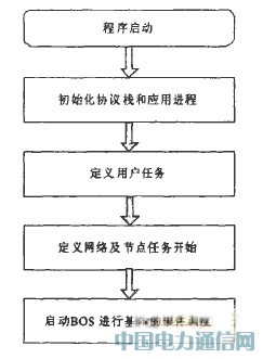 在Jennic Zigbee协议中一个基本的操作系统(BOS)。它是一个简单的时问调度器。它允许两个任务进程间通过一个简单的信息调度机制进行通信。同事BOS控制Zigbee协议栈任务和用户任务的执行。其中协议栈任务包括:网络层、应用子层APS(ApplicaTIon Sub—Layer)和Zigbee设备对象ZDO(Zigbee Debice 0bjects)的所有进程。通过事件的轮询应用实现进程的调度。整个流程如图3所示。