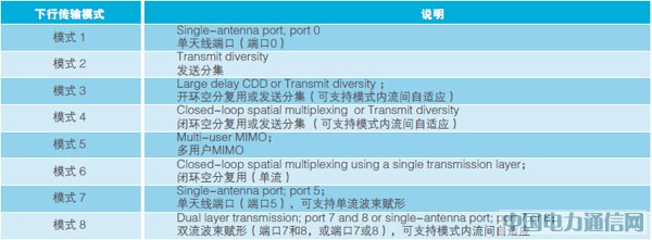 3GPP规范中Rel-9版本中规定了8种传输模式,见下表。其中模式3和4为MIMO技术,且支持模式内(发送分集和MIMO)自适应。模式7、8是单/双流波束赋形。原则上,3GPP对天线数目与所采用的传输模式没有特别的搭配要求。但在实际应用中2天线系统常用模式为模式2、3;而8天线系统常用模式为模式2、3、7或模式2、3、8。