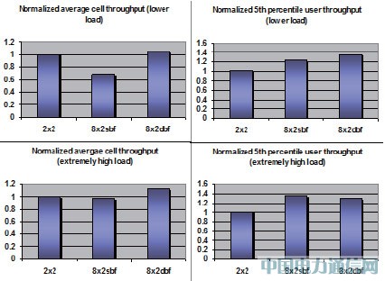 • 8X2双流波束赋型(dbf)的边界速率要略好于2X2天线空分复用。对于小区平均吞吐速率,在正常负荷条件下,二者性能相当。在高系统负荷条件下,8X2双流波束赋型(dbf)增益较为明显。