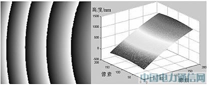 随着相位展开技术的深入发展,相位解包裹算法层出不穷[7-8]。如果仅仅应用于简单区域(未展开相位图中不存在非理想数据点)的相位展开,使用普通的基于深度的优先搜索算法即可达到目的。它通过使用阈值来判断2π相位跳变,然后建立补偿函数,最后将未展开相图与补偿函数相加,得到展开后的相位图。此算法非常简单快捷,图1是应用于一个简单区域的相位展开结果,左边为被测表面的包裹相位图,右边为其相位解包裹后的表面轮廓图。