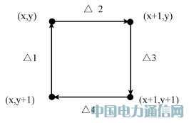 这种方法在包裹相位图的基础上进行判断。判断一个像素点是否相容,需要利用其周围的另外三个像素点的信息。这四个像素点组成一个2×2的子区域(图3)。按顺时针方向计算这四个像素点两两之间的灰度值之差,得到Δ1、Δ2、Δ3、Δ4;然后确定一个阈值T(如T=π),该阈值就是用来判断相位条纹跳变边界的那个“固定阈值”,并由此阈值判断Δk,(k=1,2,3,4):如果|Δk|>T,即可认为路径穿过了跳变的界线,此时,若Δk>0,则Δk=Δk-2π,若Δk<0,则Δk=Δk+2π,目的是将Δk限定在-π到π之间;最后求ΣΔk,再次作判断:如果ΣΔk=0,则该点定义为相容点,如果ΣΔk≠0,则该点定义为非相容点[6]。