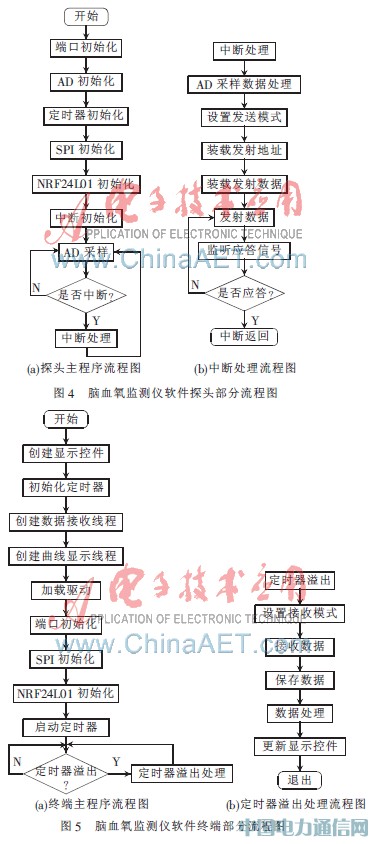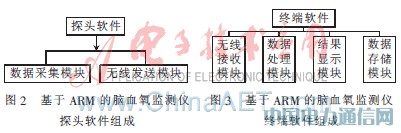 脑血氧监测仪包括探头和终端两个部分,其总体结构如图1所示。探头采用ARM7系列微控制器,分时采集采样数据,同时通过无线收发模块RF24L01实现与终端的数据传递和通信;终端采用ARM9系列微控制器,其主要功能包括数据接收、计算和实时显示大脑组织的血氧饱和度、计算血氧互相关系数和功率谱并显示结果。以下主要介绍脑血氧监测仪的软件设计与实现。