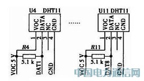 DHT11数字温湿度传感器,是一款含有已校准数字信号输出的温湿度复合传感器。测量范围相对湿度20%~90%RH,摄氏温度0~50℃。传感器包括一个电阻式感湿元件和一个NTC测温元件,并与一个高性能8位单片机相连接。数据接口采用单线制串行接口,信号传输距离可达20m以上。传感器典型连接方式如图2所示,电源正与地跟单片机电源正和地相连接,8路数据接口分别接5.1k上拉电阻与单片机P1口连接。