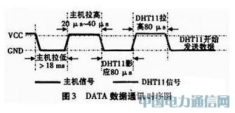 DHT11与单片机主机通讯过程时序如图3所示,总线空闲状态为高电平,主机把总线拉低大于18ms等待DHT11响应,等开始信号结束后,延时等待20~40μs,DHT11然后发送80μs低电平响应信号,然后主机读取DHT11的响应信号,若总线为低电平,说明DHT11发送响应信号,DHT11发送响应信号后,再把总线拉高80μs,准备发送数据,每1 bit数据都以50μs低电平时隙开始,高电平的长短(26μs~28μs表示数字0;70μs表示数字1)决定了数据位是0或1。如果读取响应信号为高电平,则DHT11没有响应,应当检测器件或电路。当最后1 bit数据传送完毕后,DHT11拉低总线50μs,随后总线由上拉电阻拉高进入空闲状态。当用户MCU再次发送一次开始信号后,DHT11从低功耗模式转换到高速模式,等待主机开始信号结束后,DHT11发送响应信号,送出40blt的数据,这是读到的数据为上次测量的数据,要得到实时温湿度数据,必须连续两次读取温湿度值,且第二次读到的值为当前的温湿度值。这一点特别值得注意。