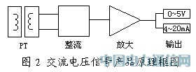 交流信号又分为交流电压和电流信号。图1为交流电流信号的检测原理框图,图2为交流电压信号的检测原理框图,由CT和PT对信号进行隔离,电流为穿孔输入方式,电压为端子接线输入方式。