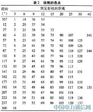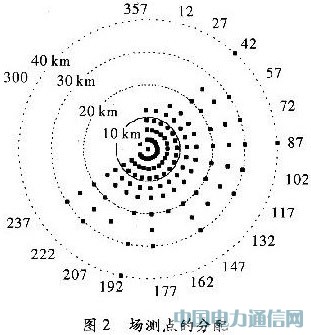 覆盖测试是根据特定的半径和幅角在圆周上进行选点的,这些测试点的选择总共包含18个不同幅角(12,27,42,58,72,87,102,117,132,147,162,177,182,207,222,287,300,357),对应于以发射机为圆心的3,6,9,12,15,20,25,30和40 km这几个半径上。选点是出于幅角的考虑,展现了至少45dBμV/m内的场强估计,并根据地形信息通过算法得到有用信息。图2展示了场测选点的地形分配,测试点的具体参数,如表2所示。
