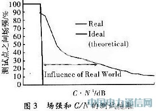 场测结果有两种纪录方法,一种是记录各测试点的场强相对于该区域场强门限的百分比,对于不同的点,又分为两种情况。如果在接收边缘区域,场强门限(Elim)定义为:Elim=Erec-M,seM>0dB,如果不在边缘区域,则Elim>Erec,seM=0dB。另一种记录方法是记录各测试点的场强相对于接收门限信噪比的百分比,如图3所示。