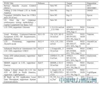 在2010年6月的RAN#52全会上,RAN5汇报了目前在研究中的WI&SI,其中涉及LTE的WI&SI如表4所示:例如有不同国家对频谱划分的需要所提出的特定频段的测试需求LTE 3500MHz,L-Band (Band 24)和北美的2GHz S-band;有Release9的技术特性(feature)如LTE Positioning定位,高通公司2010年牵头提出的Home eNB Enhancements,中国移动牵头2010年提出的Enhanced Dual-layer Transmission 的项目,华为公司2010年牵头提出的MBMS Support in LTE项目等等。同时,应GCF的需求,RAN5在2010年由Spirent牵头提出了UE Application Layer Data Throughput的Study Item,用于UMTS和LTE数据吞吐量的性能测试。