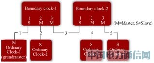 这种拓扑的网络层级较多,但是为线性结构,此时中间设备可以作为E2E透明时钟,边界时钟或普通时钟设备和每个普通时钟设备之间均需要建立主从关系(见图5)。