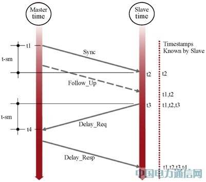 ●从设备在t3时刻发送时延请求报文,主设备在t4时刻收到此报文,并将此时间戳放在时延响应报文中发给从设备,从设备此时又记录下了t3和t4。