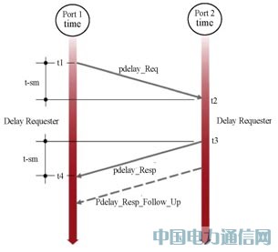 P2P对协议流程进行了优化,不只计算驻留时间,还计算出了链路时延,并把二者加在一起放到修正域中,逐跳传播累加,直到从设备。当从设备收到Sync报文时已经知道了总的传输时间和驻留时间,这样就可以直接计算出Offset并同步了,不用再发送时延请求,主设备也不用再回应时延应答了。P2P透明时钟通过和其相连的PTP设备交互对端时延请求报文和对端时延响应报文,能够知道4个时间t1,t2,t3,t4,通过Delay=[(t2-t1)+(t4-t3)]/2的计算方法算出链路时延(见图3)。