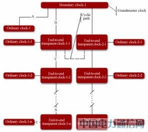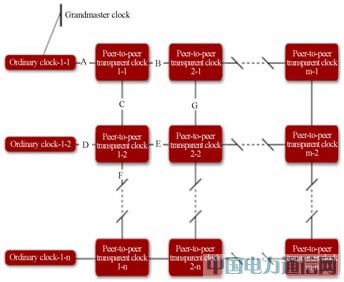 这种拓扑为网状或部分网状结构,存在很多冗余链路(PTP协议不能防止也不支持环路,需要依赖路由或生成树协议提供一个单路径环境),此时中间设备可以作为P2P透明时钟,边界时钟或普通时钟设备和每个普通时钟设备之间均需要建立主从关系。此网络拓扑部署P2P透明时钟能够利用其快速完成重计算的优点(见图6)。
