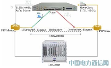 思博伦(Spirent)公司提供两种产品用于测试IEEE1588——Anue和TestCenter,两种产品可以独立或组合使用,能够满足不同用户的测试需求,提供全面的IEEE1588测试解决方案,测试组网参考图7。