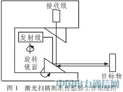 LMS激光传感器是一种户外型非接触式的高精度、高解析度外部传感器,其工作原理是基于对激光束飞行时间的测量,其按照定义好的时间间隔发出激光脉冲,通过定时器计算发射脉冲和接收脉冲之间的时间间隔来得到与被测物体之间的距离。脉冲激光束经过测距传感器内部的一个旋转反光镜的反射对周围环境形成扇面扫描。激光扫描测距的工作原理如图1所示。