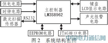 智能车辆宽高检测系统选用LM3S8962作为主控制器。LM3S8962是一款基于ARMCortex-M3内核的低功耗、高速度处理器。LMS激光传感器通过500kb/s的高速串行接口将测量数据传送给主控制器,不会造成数据的丢失。控制器将接收到的扫描数据进行处理,由于其内部数据存储器空间大,不需外扩数据存储器。系统结构框图如图2所示。