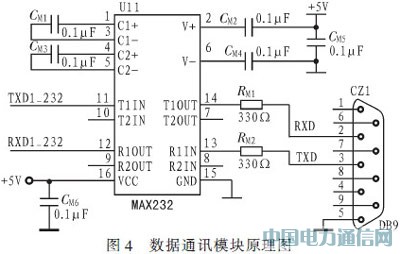 将激光传感器扫描得到的极值坐标信号通过通用异步收发器(UART)传送给微控制器,选用了MAX232进行RS232电平转换,如图4所示。