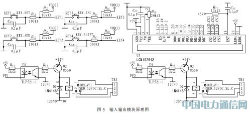 系统设置了4个按键,用于设置车辆的限宽限高值,设置及修改系统时间等,实现了随时修改信息的功能。为了便于工作人员查看过往车辆的宽度和高度,采用了LCD显示。选用青云创新公司生产的LCD液晶显示模块LCM192642,它是汉字图形点阵液晶显示模块,可显示汉字和图形。模块工作电源为5V;改变变位器W1的值可以调节LCD屏的显示对比度;整个LCD屏被均分为三部分16~18是选屏信号线,可以选择其中任一部分显示。系统中设置了2个12V继电器,当行驶车辆经检铡超过了标准的宽度和高度时系统会通过继电器分别接通警灯和室外扩音器的电源而产生声光报警,一方面提示现场工作人员进行处理,另一方面告知司机该车超限需停车接受处理。如下图5所示为输入输出模块原理图。