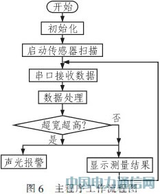 本系统采用LAR5.11作为开发环境,使用C语言编程,采用模块化程序设计。软件设计分为主控模块、初始化模块、中断处理模块、数据发送和接收模块、数据处理模块、键盘和显示模块等几部分。主程序工作流程图如图6所示。系统上电后,首先完成系统初始化,然后给传感器发命令,启动传感器扫描,接收串口发来的数据,从串口缓冲区提取所需数据,根据数据信息进行转换,判断,比较,存储。进行数据分析处理后调用相应的执行子程序完成相应的功能,如调用LCD子程序显示车辆宽高信息等,程序进入不断循环工作状态。