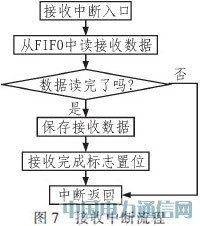 数据采集使用串口通讯模式,发送数据采用查询方式完成,接收数据采用中断方式完成,接收中断流程如图7所示。传感器和主控制器之间通过事先约定的通讯协议进行数据收发,主控制器只需设置好相应的串口号、波特率及相应端口设量,发送测量命令,等待接收。单次读数据命令为:RNLMDscandatata;连续读数据命令为:EN LMDscandata1;连续停数据命令为:EN LMDscandata0。