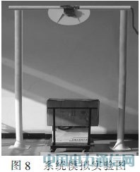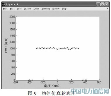 系统整体设计完成后,在进入超限点进行现场调试之前,在实验室进行了模拟实验。将激光传感器固定在3m高的支架上,让一放置立方体被测物的小推车以10km/h的速度从激光传感器下经过,如图8所示。将激光传感器设置在扫描角度为0°~180°,角度分辨率为0.5°的模式下,当小推车完全经过时,液晶屏上即可显示立方体被测物的最大宽度和高度,同时可通过MATLAB仿真物体的轮廓,如图9所示。同等条件下,让小推车在传感器下先后通过数次后统计结果,将测量值和实际值比较可得误差在0.15m以内的达到95%,符合测量精度要求。