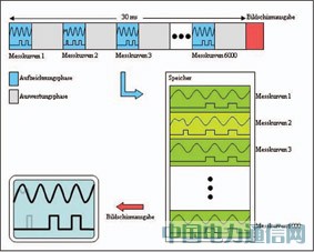 两次屏幕刷新期间,所采集的全部二进制信号均采取了叠加处理。采集速度为20万个波形/s时,屏幕上可以同时显示所采集的全部6000左右个波形(见图2)。因此,用户可以对对于整个时间段内的二进制信号状态和边沿转换频率有足够信息的总体认识。此后,用户可以采用搜索功能,从存储器中读出各个波形,并进行更加精确的分析。