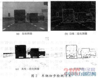 车辆初步检测的流程如图1所示。车辆阴影和车道一样具有灰度突变的特点,因此可以调用车道检测算法对图2(a)中的原始图像做二值化处理,得到图2(b)中的边缘二值化图像。同时还要对原始图像进行灰度二值化,得到图2(c)中的灰度二值化图像。为提高检测实时性,以本车附近路面区域的平均灰度作为二值化阈值。由于边缘二值化图像和灰度二值化图像都包括了车辆的下底边,将这两幅图像进行“或”运算,就可以得到如图2(d)所示的车辆阴影图像。
