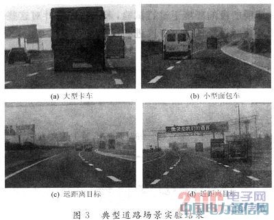 可以看出,系统能够检测到本车道内不同距离上的各种车型车辆。在高速公路上的实验结果表明,在最大车速100 km/h的情况下,系统在Celeron M 600 MHz处理器上的处理速度为8 j/s左右,也就是说处理一帧图像的时间内车辆行驶3~4 m,基本满足实时报警的要求。在一般光照条件下,系统正常报警的纵向距离超过200 m,视场角远远大于雷达(一般为±7°)。