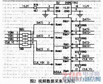 摄像头摄录的视频数据以LVDS差分电平信号进行传输,需要进行电平信号转换才能进行后续视频信号的记录处理。摄像头传输的视频数据包括4对LVDS差分信号,CLK+/CLK-是采集数据的时钟,其余3对差分信号包含着像素灰度。差分信号经过DS90LV032转换,变成4个单端的数字信号,供后面的电路处理。视频采集电路如图2所示。