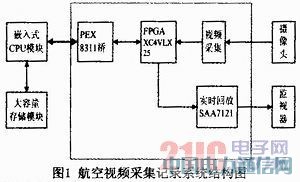 在航空视频采集记录系统中,摄像头把载机任务系统的实时画面视频数据按预定格式组帧,通过LVDS信号总线传输给视频采集模块;经过视频采集模块对LVDS信号电平进行变换处理后,将单端视频数字信号送给可编程逻辑器件(FPGA)进行视频解码处理。解码后的数字视频,一方面通过SAA7121视频编码器直接送给监视器,让飞行员实时掌握训练情况与效果:另一方面通过高速PCIe总线传送给嵌入式CPU模块进行视频数据压缩存储,供事后分析。航空视频采集记录系统总体结构如图1所示。