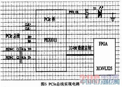 采集的视频数据经过FPGA解码处理后需要通过PCIe总线传输给嵌入式CPU以便于实时压缩存储。实现高速的PCIe总线是海量数据传输的关键。数据传输总线技术是不断更新发展的过程。在数据通讯的起初阶段,串行通讯因为信号简单、实现方便而应用广泛,占有统治地位,例如RS422串行通讯,尽管速率不高,目前仍然很有生命力。为解决串行通讯的瓶颈问题,开始采用并行传输总线,并行通讯的速率取决于时钟频率和数据宽度。目前最流行33MHz/32bit的PCI总线,峰值传输速率可达132Mbps。当继续提高时钟频率时,并行通讯总线的数据宽度却成为继续提高速率的障碍。由于极高频下的线路串扰和反馈,难以保证多路并行总线信号数据同步的一致性,数据通讯的传输技术从并行回归到串行,并行双向的PCI总线发展为串行单向的PCIe总线。速率高达2.5Gbps的PCIe总线有三对差分信号,即同步时钟CLK+/CLK-、接收信号R+/R-和发送信号T+/T-。PCIe总线设计电路如图5所示。