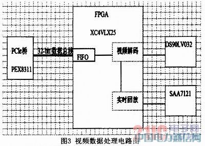 当前端DS90LV032将经过信号转换以后的视频数据传输给FPGA,由FPGA完成视频信号的解码还原、格式转换后同步传输给CPU模块进行实时记录和实时回放视频模块。FPGA视频数据处理的硬件接口设计如图3所示