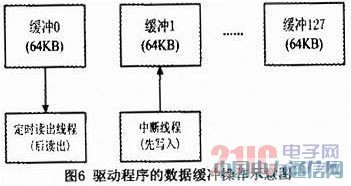 系统的软件设计平台采用WindowsXP Embedded,软件分为针对本硬件系统的驱动程序和视频压缩与处理的应用程序。应用程序把视频存为普通播放器能播放的视频格式,每帧视频为256行×256列共64K像素。在驱动软件中,当打开设备时,申请一组缓冲,共128个缓冲。这个缓冲对应用程序是透明的,每个缓冲可以存放一个完整的视频帧,如图6所示。驱动程序中有两个主要线程,中断线程和数据读出线程。