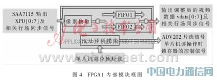 压缩后数据通过JDATA端口传输给FPGA2,将压缩数据打包和并转串后,接入数传通道。为了便于FPGA2接收数据,ADV202主机总线采取JDATA的同步输出模式。单片机是系统的主控者,完成对ADV202和SAA7115的初始化。对SAA7115的初始化通过I2C总线进行。ADV202的初始化需要片选线、读写信号线、4根地址线和16 bit数据线来加载固件和设置寄存器参数。但是单片机是8 bit数据线,而且数据线和地址线复用,所以使用了两个锁存器74HC573来实现16 bit数据的读写。锁存器的读使能信号和ADV202的片选信号由单片机的高位地址线输入到FPGA1内部译码组合后输出。FPGA1主要完成像素抽取、视频数据结构调整和输出ADV202的控制信号,内部模块如图4所示。利用FPGA内部的块RAM,生成2个FIFO,乒乓处理数据,从而达到实时处理数据。