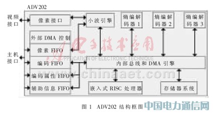 ADV202是AD公司的一款实现JPEG2000编解码的芯片。图1给出了ADV202结构框图。该芯片主要由像素接口、小波变换引擎、熵编解码器、嵌入式处理器、存储器系统和内部DMA引擎等组成。ADV202内嵌了一个32位的RISC处理器,作为整个系统的控制者。这个RISC处理器具有自己的程序和数据存储器所对应的ROM和RAM。ADV202集成了一个基于ADI专利的空间高效递归滤波小波技术(SURF技术)的小波核。可以支持高达6层分解的9/7和5/3小波变换。由于熵编码的复杂度,ADV202提供了3个专用的硬件熵编码器。ADV202的内部DMA引擎为内部存储器之间、内部存储器和各个功能模块之间提供高速传输数据能力。ADV202的视频接口支持CCIR656、SMPTE125M PAL/NTSC、SMPTE293M(525p)、ITU.R-BT1358(625p),或者任何最大输入速率在非可逆模式下为65 MS/s、在可逆模式下为40 MS/s的视频格式。ADV202有编码和解码两种工作模式。在编码模式下,视频数据通过VDATA总线输入ADV202,由小波核对输入的数据进行小波变换,并把所有频率子带的小波系数存入ADV202内部的存储器。每一个子带根据ADV202编码参数的设置进一步分成编码子块,然后由熵编码器对编码子块执行内容建模和算术编码,运算结果存入内部存储器。随后由内部DMA传输到CODE FIFO,通过HDATA总线把压缩数据流从ADV202输出。在解码模式下,工作过程是编码模式的逆过程。视频接口(VDATA总线)支持单通道输入YCrCb格式的8 bit、10 bit和12 bit数字视频信号,还支持双通道输入Y和CrCb分离的16 bit、20 bit和24 bit数字视频信号,但必须是4:2:2格式,这种视频信号可以伴随HVF(行场同步信号),也可以内嵌入EAV/SAV同步字节。主机接口(HDATA总线)提供有16 bit和32 bit初始化数据控制总线及8 bit、16 bit和32 bit数据输出总线,支持多种输出模式,包括正常主机模式、JDATA模式和DMA模式。其中JDATA模式是一种同步模式,8 bit输出数据宽度。