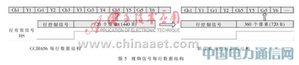 CCIR656格式视频信号每行的数据结构如图5所示[6-7],每行数据包括水平控制信号和亮度色差信号(Y,Cb,Cr)。CbYCr是指同址的亮度色差信号取样,后面Y对应于下一个亮度取样,比例是4:2:2。由于ADV202只接收4:2:2的YCbCr格式视频信号,故采取图5所示的跳像素方法,HS也做相应变化。