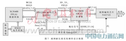 解压缩系统是压缩系统的逆过程。信道为FPGA1提供同步时钟,在这个时钟下,FPGA1读取信道发送的数据,并进行数据串转并,如图7所示。在FPGA1内部同时完成补场,采取重复前一场的方法补齐每秒50场,以此实现ADV202图像解压的实时性。视频压缩数据通过JDATA端口发送给ADV202。解压缩后的数据通过VDATA总线发送给FPGA2完成补像素,把图像调整为标准的CCIR656数字视频格式;然后通过MP端口传送给视频编码器SAA7121,转换成模拟视频,并在显示器上显示。软件方面,对于SAA7121的配置仍采用I2C总线来完成,ADV202的初始化与压缩系统相同,只是加载的固件不同。