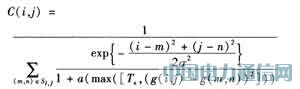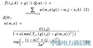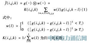 由式(2)和式(3)可见,本算法的空域自适应滤波为避免毁坏图像各帧中的边缘、纹理等细节,当前像素的滤波值只由滤波器范围内彼此相近的像素决定,当某像素与当前像素差别较大时,其权值很小,因而对当前点的滤波值的影响也很小。同时,与当前像素空间位置越接近的点对当前像素的滤波值影响越大,这进一步减轻了空间滤波过程对图像的空间细节的毁坏。