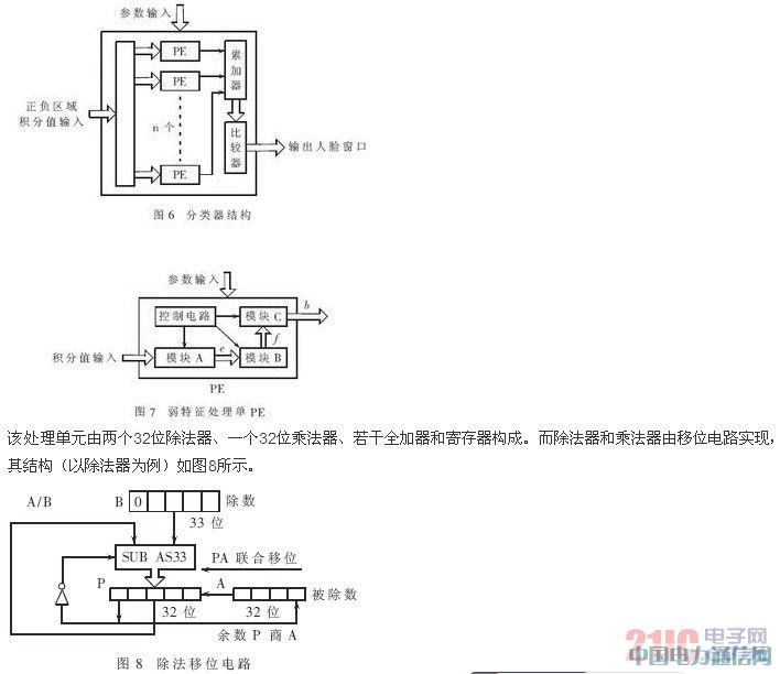 分类器由若干弱分类器和外围电路构成,其内部结构如图6所示,其中每一个弱分类器(PE)内部结构如图7所示,PE每部分实现的功能分别是:模块A:计算该窗口的微结构特征值e;模块B:归一化处理微特征值e得f;模块C:得出该窗口微特征阈值b;控制电路:控制模块间的时序即PE内部与外部的数据交换。